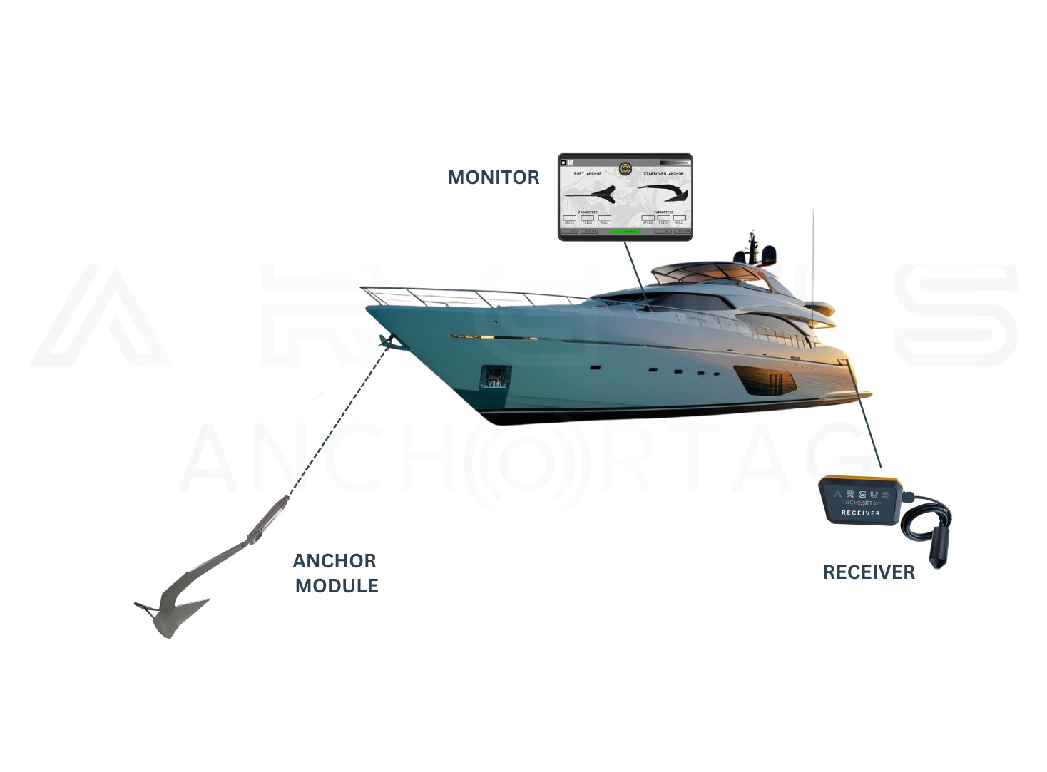 A R G U S AnchorTag system comprises of a Transmitter on the anchor shank between the anchor and the chain, a floating Receiver, and a handheld Monitor.